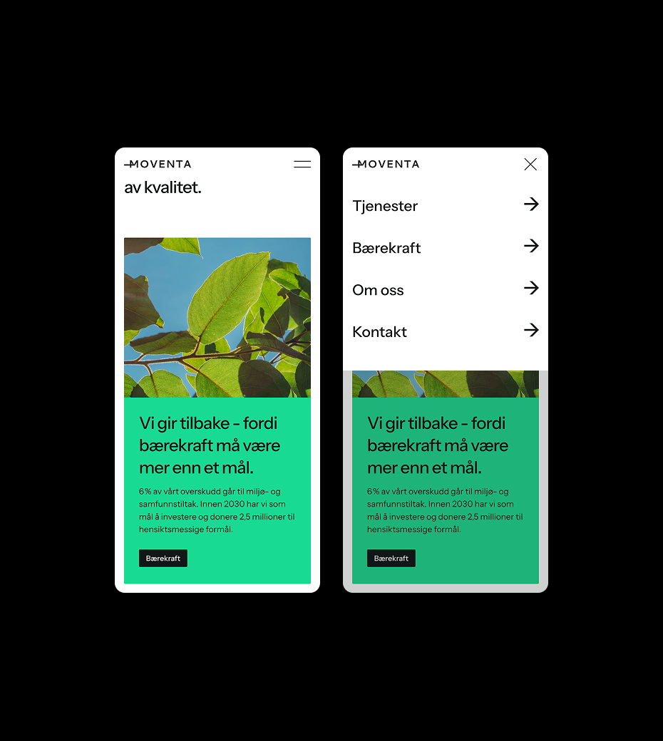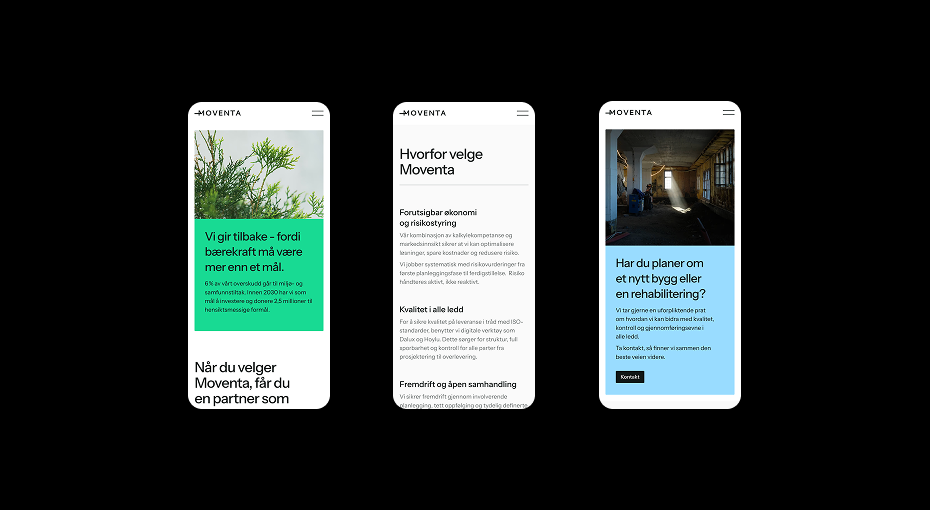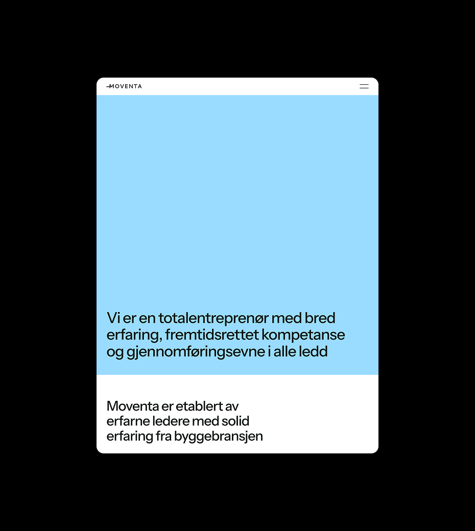 For Moventa utviklet vi en ny visuell identitet og nettside som reflekterer selskapets rolle som en helt ny totalentreprenør. Målet var å lansere merkevaren med et tydelig visuelt uttrykk, samtidig som nettsiden formidler Moventas fokus på kvalitet, bærekraft og effektiv prosjektgjennomføring. Resultatet er en moderne, ryddig og engasjerende presentasjon av selskapets tjenester og verdier.